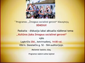 Programos  „Žmogaus socialinė gerovė“ užsiėmimas įvyks lapkričio 14 d. (ketvirtadienį) 14:00 val. VDU, K. Donelaičio g. 52., 402 a.